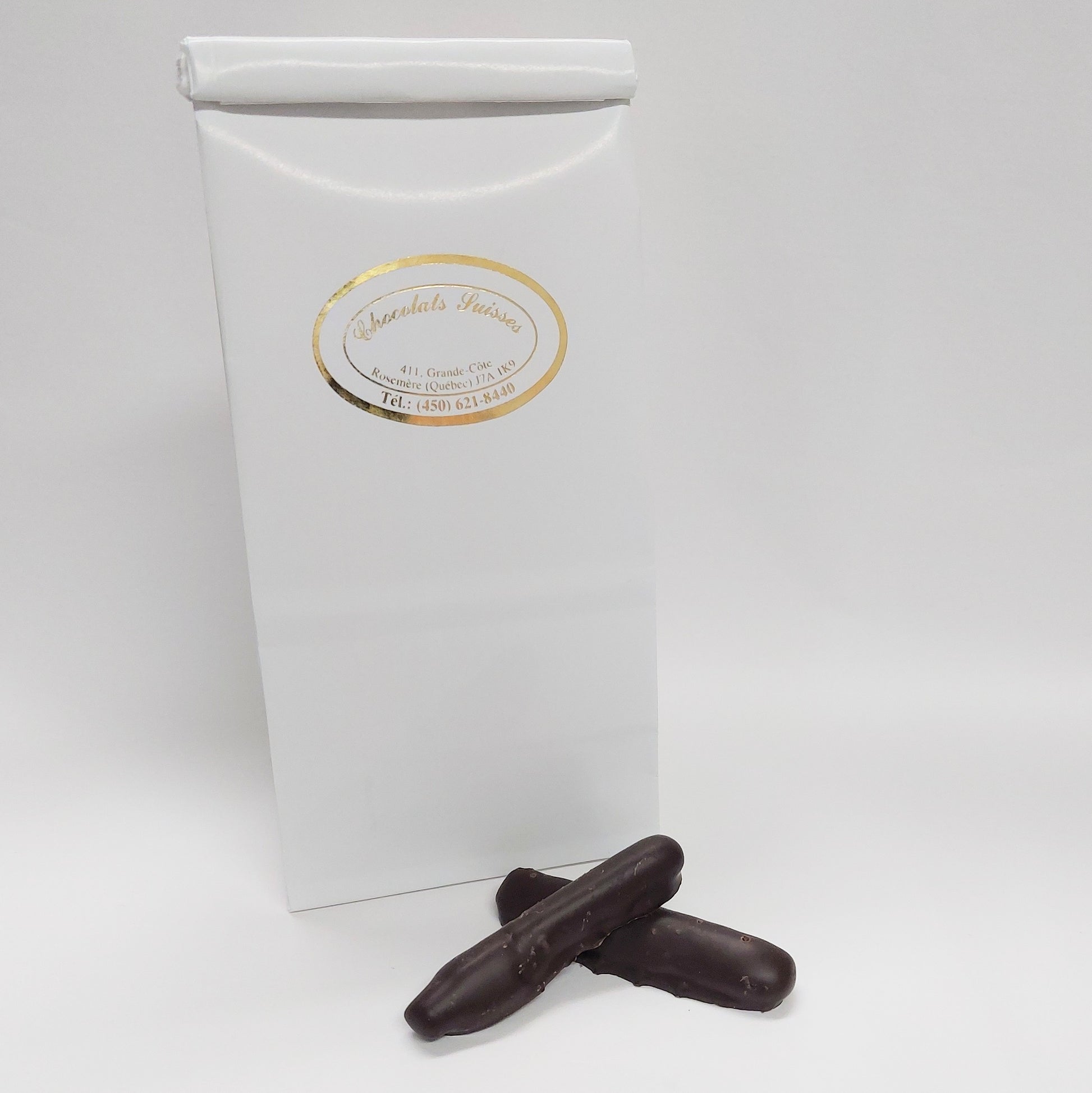 Sachet de 80g d'aiguillettes d'orange confites enrobées de chocolat noir 58% de cacao.